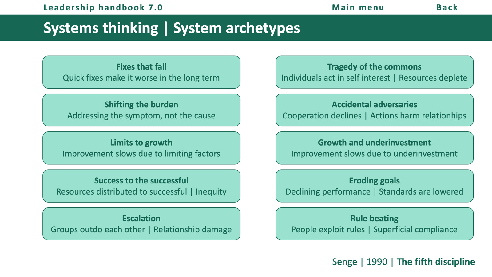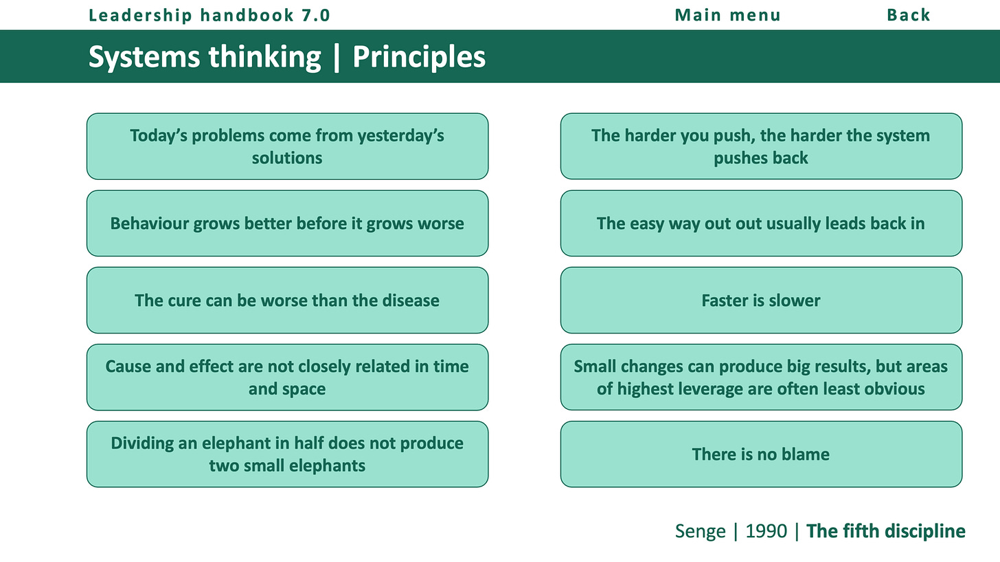 To get better at systems thinking, let’s prompt ourselves to remember the principles of systems thinking before we launch into our solutions. When we get the point of exploring options for decision making, Senge’s systems thinking principles can help us to interrogate possible courses of action and consider the intended and unintended consequences of our options.